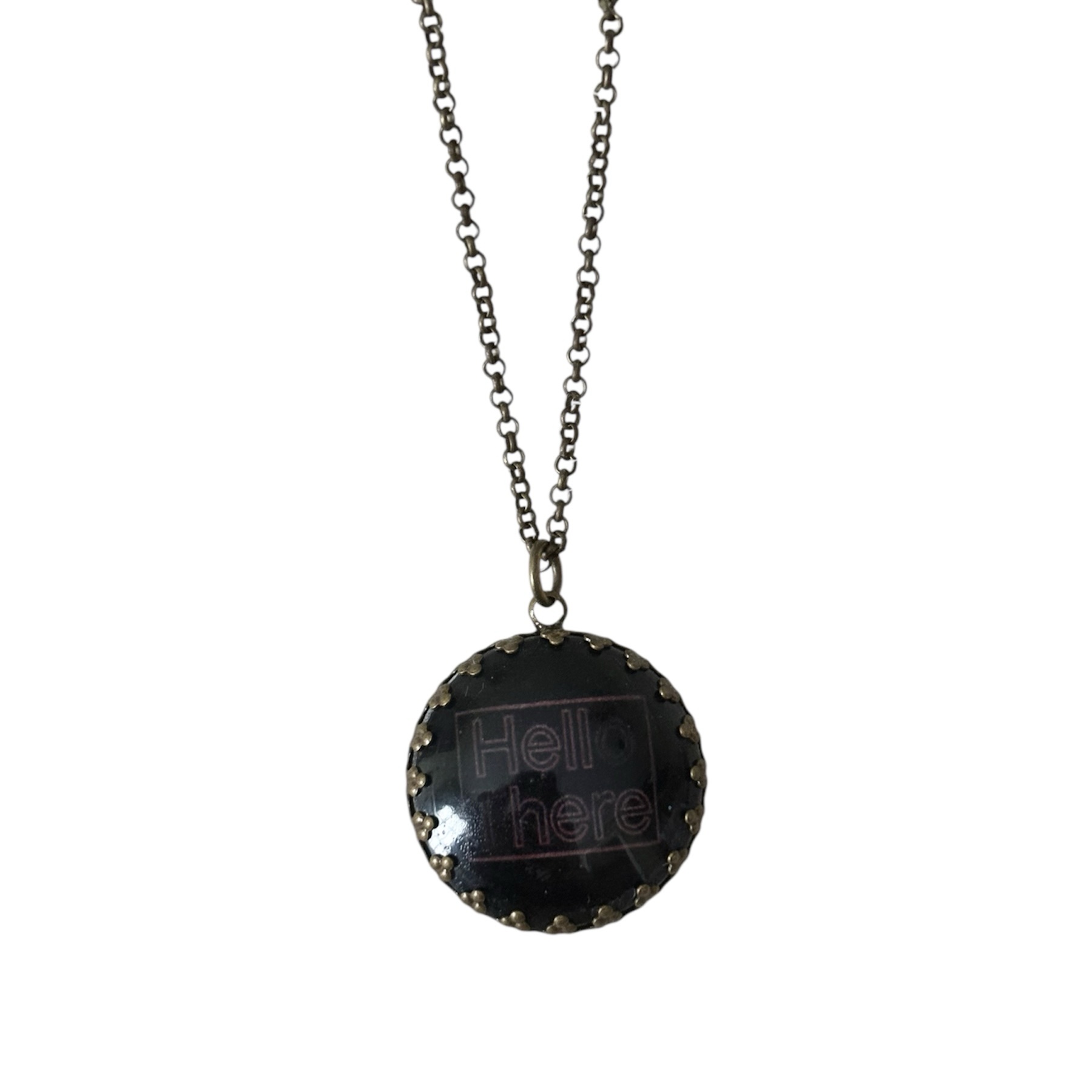The pendant measures 2.25 inches long, and the brass chain measures approximately 28 inches long. You will not receive the exact pendant pictured.